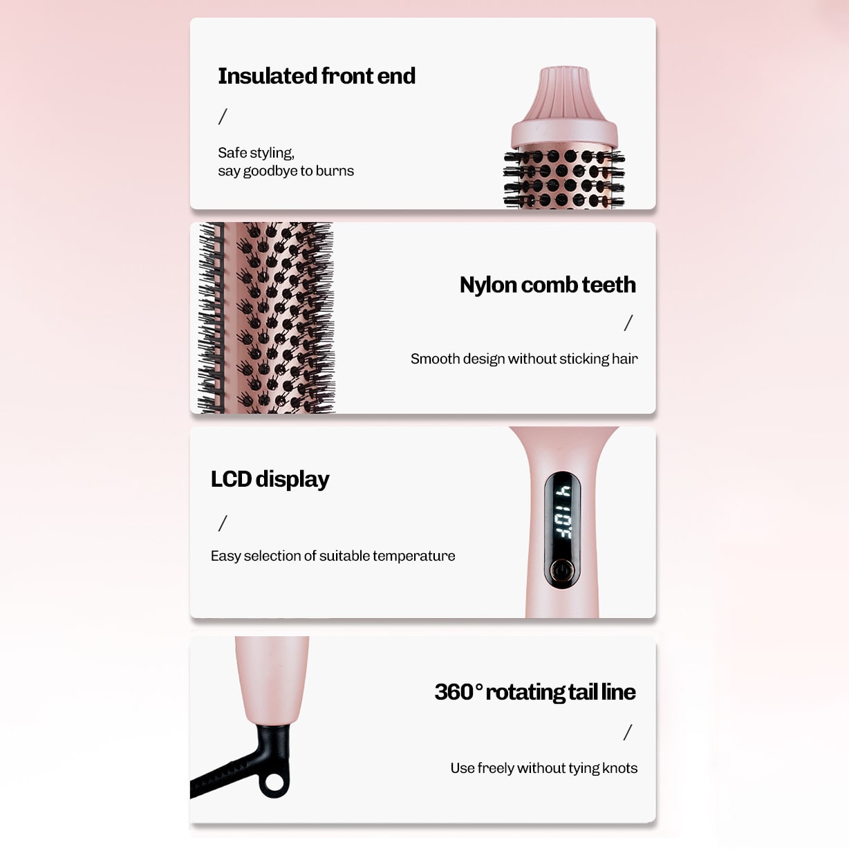 The integrated PTC heating elements ensure fast heat-up time and even heat distribution, so the hair is shaped and styled while brushing. The extended bristles grip the hair securely and make it easier to create waves, volume or soft curves – without the need for an additional straightener or curling iron.