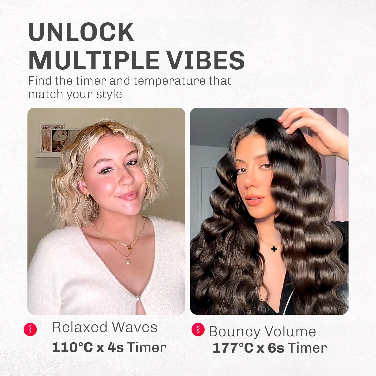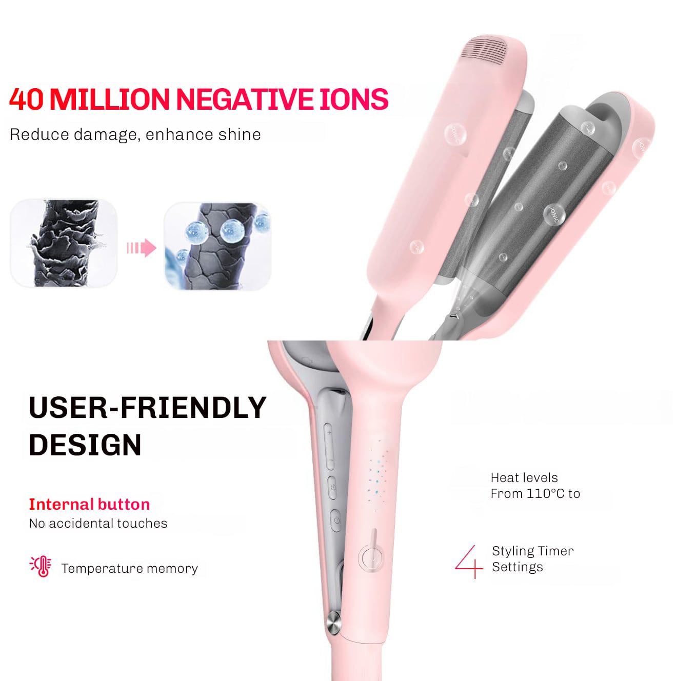 The NovaCurl Ionic Wave Iron creates large, shiny waves in no time, just like a professional – with no prior experience needed. The 25 mm ceramic barrels with integrated clamp ensure even beach waves in just a few minutes. Thanks to the advanced ion technology, frizz is reduced and the hair gains visibly more shine and smoothness. The device heats up in just 30 seconds and offers four temperature levels from 140 °C to 220 °C, which can be precisely adjusted via a digital LED display. The fully insulated outer shell provides reliable protection against burns and makes styling particularly safe – ideal even for beginners. Whether fine, thick, short or long hair: the NovaCurl adapts to your hair type and delivers long-lasting, natural waves with minimal effort. A reliable companion for quick, gentle styling at home or on the go.